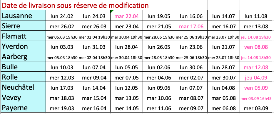 Les livraisons sont régulières et effectuées à des heures fixes toutes les 4 semaines aux mêmes points de retrait pour garantir une disponibilité constante.